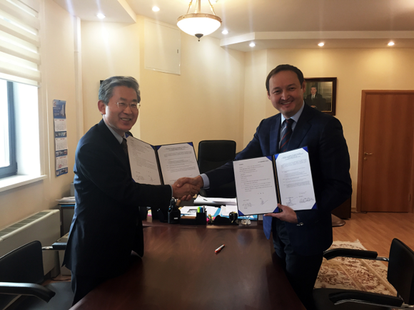 ▲(왼쪽부터) 부민병원 정흥태 이사장, 아헤토브 아미르(Ahetov Amir) 보건국 차관. (사진제공=부민병원)