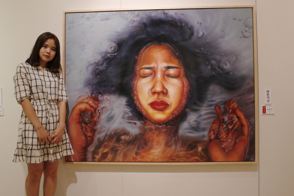 ▲'제34회 대한민국 미술대전'에서 평론가상을 수상한 송은주 학생이 수상작 '숨' 옆에서 포즈를 취하고 있다. (사진제공=동아대)