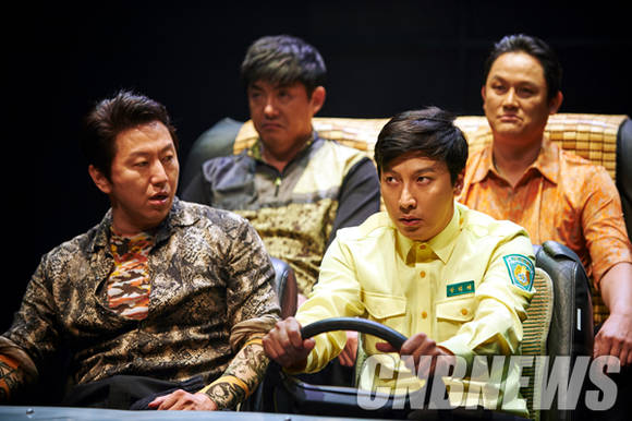 ▲연극 '택시 드리벌'의 한 장면. (왼쪽 위부터 시계 방향으로)임철형, 강성진, 박건형, 김수로가 열연 중이다.(사진=아시아브릿지컨텐츠)