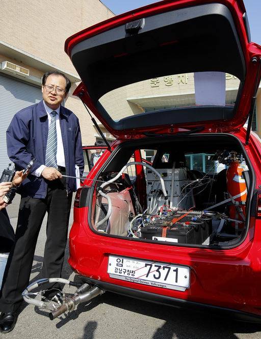 ▲김정수 국립환경과학원 교통환경연구소 소장이 6일 오전 인천시 서구 국립환경과학원 교통환경연구소에서 유로6엔진을 장착한 폭스바겐 골프 GTD(경유 사용) 모델의 실제 도로 배출가스 시험과정과 장비를 설명하고 있다. 환경부 산하 국립환경과학원 교통환경연구소는 이날부터 다음달 중순까지 국내에서 판매된 폭스바겐 차량 7종에 대한 ‘배출가스 조작’ 여부를 정밀 조사한다. (사진=연합뉴스)