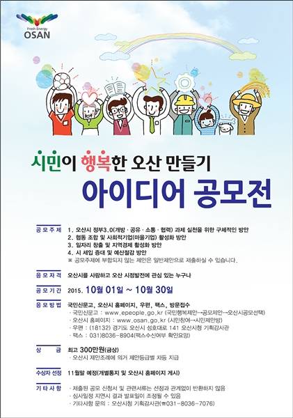 오산시(시장 곽상욱)는 시민이 행복한 오산 만들기 아이디어 공모전을 지난 1일부터 오는 30일까지 시행한다고 밝혔다.