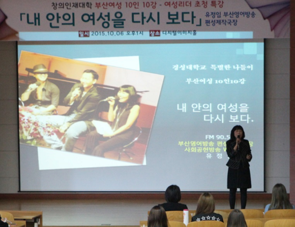 지난 6일 초청된 여성리더는 유정임 부산영어방송 편성제작국장으로 '내 안의 여성을 다시 보다'라는 주제로 특강을 개최했다. 유 국장은 여성들이 일과 가정 속에서 성공할 수 있는 마인드와 글로벌리더로 성장하기 위해 버려야 할 마인드를 강사자신의 생생한 경험담을 통해 들려주어 학생들로 부터 많은 공감을 얻었다.