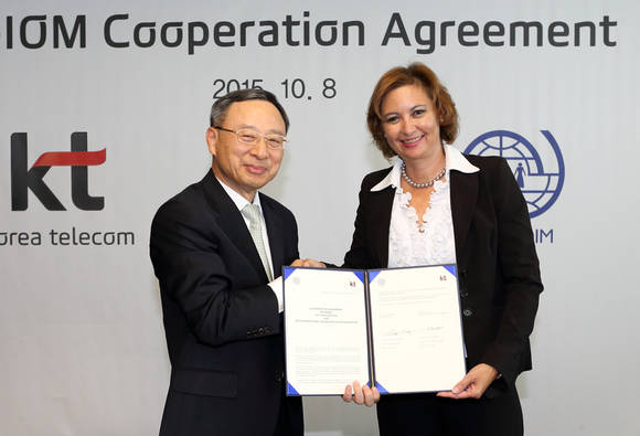 KT는 8일 오후 광화문 사옥에서 KT 황창규 회장과 국제이주기구 IOM(International Organization for Migration)의 로라 톰슨 부사무총장이 참석한 가운데 맺은 KT-IOM 간 업무 협약을 시작으로 글로벌 기가스토리 확산을 본격적으로 추진할 계획이라고 밝혔다.