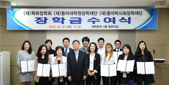동아대학교 대학원(원장 김영한)이 (재)목화장학회와 (재)동아대학원 장학재단, (재)동아박사회 장학재단으로부터 위임받아 지난 7일 오전 11시 30분 승학캠퍼스 3층 중회의실에서 2015학년도 장학금 수여식을 개최했다.
