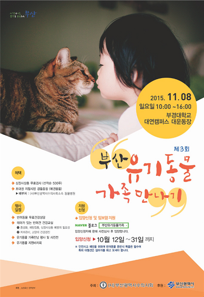부산시는 유기동물 입양문화 조성, 반려동물에 대한 생명 존중의식과 책임감 고취를 위한 '제3회 부산 유기동물 가족만나기' 행사를 11월 8일 오전 10시 부경대학교 대연캠퍼스에서 개최한다고 13일 밝혔다.