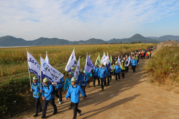 이번 27차 'S&T 해안누리 국토대장정'에서 S&T그룹 임직원 및 가족 330여명의 참가자들은 순천만의 가을들녘을 즐길 수 있는 장산마을부터 갈대가 절정인 순천만 자연생태공원을 거쳐 와온해변까지 약 11km를 걸었다.