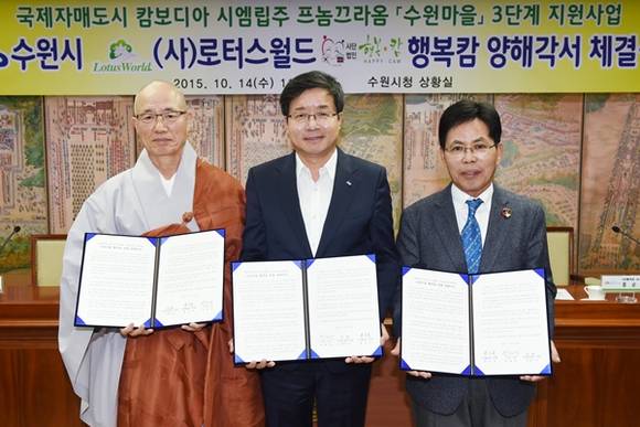 이날 체결식에는 염태영 수원시장, 로터스월드 이사장 성관스님, 행복캄 홍순목 이사장 등이 참석한 가운데 내년 1월부터 2018년 12월까지 진행되는 캄보디아 수원마을 지원 제3단계 사업의 성공적 추진을 위해 상호 긴밀한 협력관계를 구축하기로 했다.