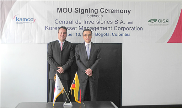 한국자산관리공사(캠코, 사장 홍영만)는 13일(현지시간) 콜롬비아 공공자산관리공사(Central De Inversiones S.A., 사장 카를로스 이반 비예가스) 본사에서 업무협력을 위한 양해각서(MOU)를 체결했다.