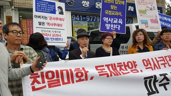 ▲역사학자 이이화 씨가 파주시에서 시민들과 역사교과서 국정화를 반대하며 발언하고 있다.(사진= 김진부 기자)