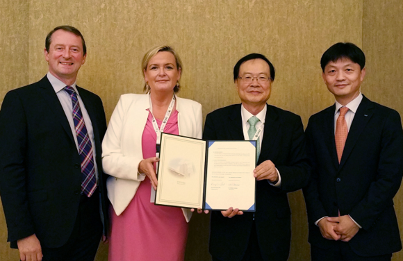 한국거래소(KRX, 이사장 최경수)는 19일 카타르 도하에서 개최된 세계거래소연맹(WFE) 총회 참석 중 아일랜드거래소(ISE)와 양국의 자본시장 발전 협력을 위한 양해각서를 체결했다. (사진제공=한국거래소)