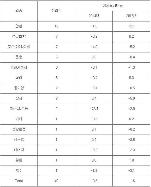 이어 현대미포조선(-71.7), 쌍용자동차(-67), 현대삼호중공업(-52.3) 등도 영업적자로 인해 이자보상배율이 2년 연속 마이너스를 기록했다. 계룡건설산업(-4.2), 한화건설(-3.8) 등 25곳도 이자보상배율이 0에 못미쳤다.