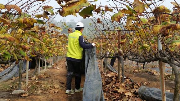 이날 봉사단원들은 화성시 서신면에 위치한 2000여평에 달하는 포도밭에서 폐비닐 등을 치우며 구슬땀을 흘렸다.