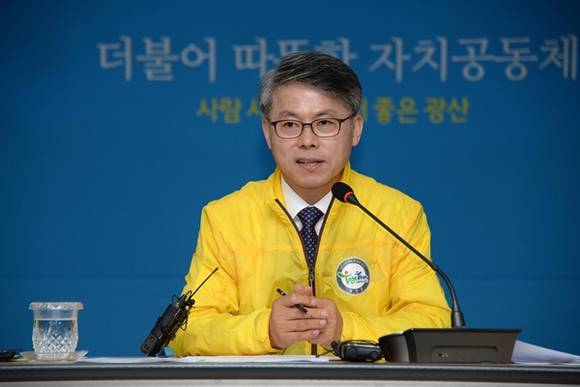 ▲민형배 광산구청장이 21일 기자회견을 갖고 '광주 군공항 소음피해 실태조사 연구용역' 결과를 설명하고 있다.(사진=광산구)