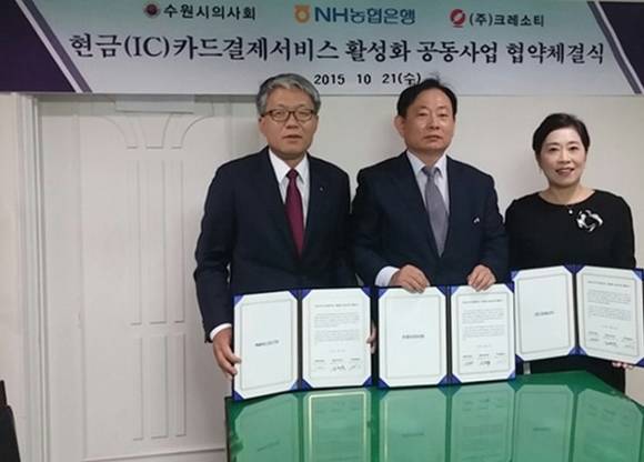 NH농협은행수원시지부(지부장 김희득)는 수원시의사회(회장 김영준), ㈜크레소티(대표이사 박경애)와 수원시 개업의를 대상으로 안전하고 경제적인 결제서비스 보급에 앞장서고자 21일 수원시의사협회 회의실에서 현금(IC)카드 결제활성화 양해각서를 체결했다.