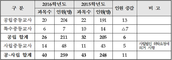 공립 26과목 211명, 사립 14과목 48명 등 총 259명 선발