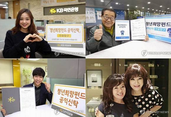 ▲문화·체육계도 청년희망펀드 동참행렬이 줄을 잇고 있다. 기부금 모집 창구를 개설한 KB국민, 신한, 우리, 농협은행의 유명인을 앞세운 홍보마케팅도 한창이다. (윗줄 왼쪽부터 시계방향으로) ‘리듬체조 요정’ 손연재, 방송인 송해, 가수 노사연과 친언니 노사봉, 가수 이승기씨가 ‘청년희망펀드’에 가입한 뒤 기념촬영을 하고 있다. (사진=연합뉴스)