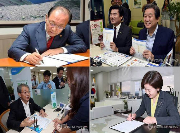 ▲박근혜 대통령이 일시금으로 2000만원을 기부하면서 청년희망펀드 기금조성에 시동을 걸자 여권이 앞다퉈 동참하고 있다. (윗줄 왼쪽부터 시계방향으로) 황우여 부총리, 새누리당 김무성 대표와 원유철 원내대표, 김희정 여성가족부장관, 임종룡 금융위원장이 각각 청년희망펀드에 가입하고 있다. (사진=연합뉴스, 여성가족부, 농협은행 제공)