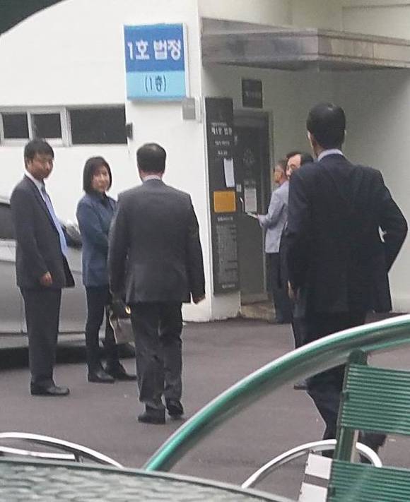▲26일 오후 김경희 건국대 이사장(왼쪽 두번째)이 서울동부지방법원 1호 법정 앞에서 결심공판에 들어가기 전 학교 관계자들과 얘기를 나누고 있다. (사진=도기천 기자)