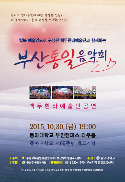 부산지역 통일교육센터(센터장 동아대학교 총장 권오창)가 오는 30일 오후 7시 동아대 부민캠퍼스 다우홀에서 ‘부산통일음악회’를 개최한다.