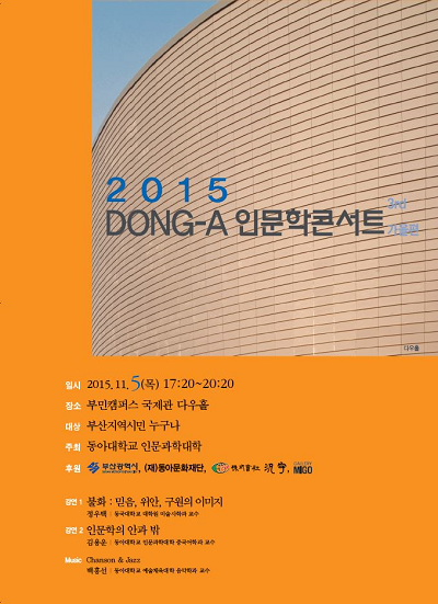 동아대학교(총장 권오창)는 다음달 5일 오후 5시 20분 부민캠퍼스 다우홀에서 '2015 DONG-A 인문학 콘서트(가을편)'를 개최한다.