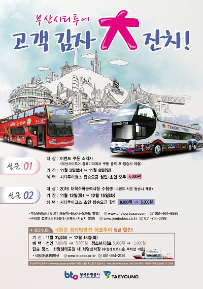 부산 시티투어버스는 다음달 3일부터 8일까지 1만5천원에서 5천원으로 탑승할 수 있다. 공사와 부산시티투어 홈페이지에서 특별 할인권을 다운 받아 탑승시에 제출하면 된다.