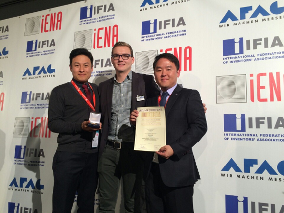 ▲'2015 독일 국제발명대전(iENA 2015)'에서 금상을 수상한 남부발전 김주환 차장(오른쪽)과 이재규 차장(왼쪽)이 독일 관계자와 기념촬영을 하고 있다. (사진제공=남부발전)