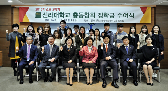 신라대 총동창회는 5일 오후 5시 교내 종합정보센터 3층 회의실에서 류경화 총동창회장과 이범진 학생지원처장 등 주요 관계자가 참석한 가운데 2015학년도 2학기 총동창회 장학금 수여식을 가졌다. 총동창회는 이날 20명의 재학생들에게 1인당 100만원씩 총 2000만원의 장학금을 전달했다. (사진제공=신라대)