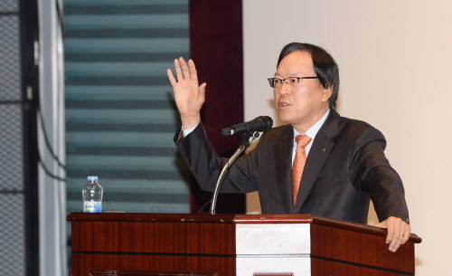 ▲김용환 NH농협금융지주 회장이 지난 6일 농협은행 본관 NH아트홀에서 열린 ‘NH농협금융 경영간담회’에서 지주 및 계열사 부장・팀장급 직원들에게 취임 이후 6개월간 전국 영업현장을 돌며 현장 직원들과 소통하며 느낀 점을 전달하고 있다. (사진제공=NH농협금융)