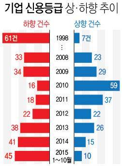 한국신용평가에 따르면 올해 1∼9월 신용등급이 강등된 기업은 45개사(부도 1개사 포함)로 나타났다. 1998년 외환위기(61개사) 이후 가장 많은 규모다. 글로벌 금융위기가 닥친 2008년엔 33개, 이듬해엔 34개 정도였다.