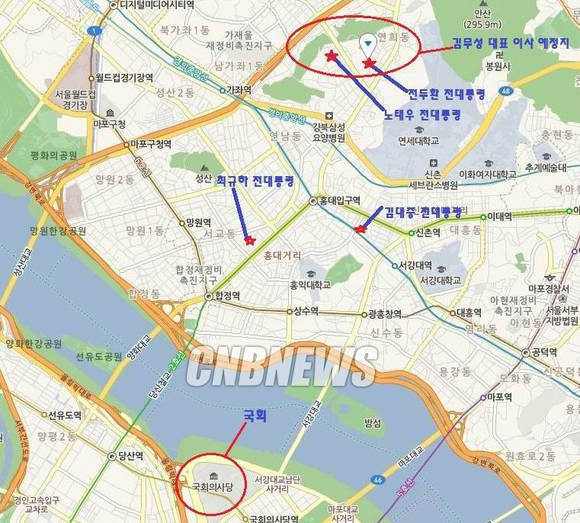 ▲연희동 인근에서 4명의 대통령이 배출됐다. CNB가 차로 운행해보니, 국회와 연희동의 거리는 약5킬로미터 정도며 15분 가량 걸렸다. (지도=네이버)