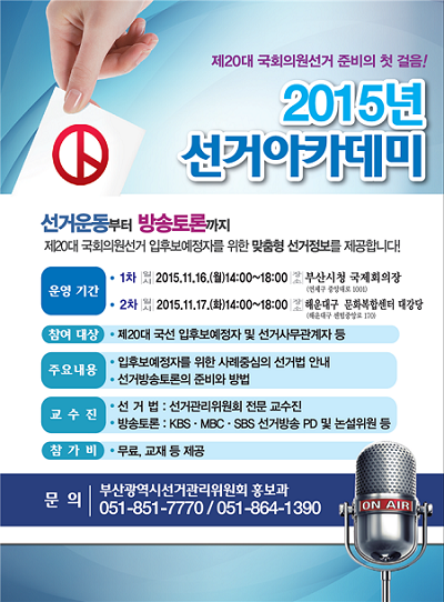 부산시선거관리위원회(위원장 강민구)는 내년 4월 13일 실시하는 제20대 국회의원선거를 앞두고 입후보예정자와 선거사무관계자 등을 대상으로 '선거아카데미'를 개최한다고 11일 밝혔다.
