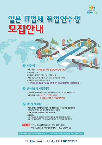 수원시는 취업 연수생 30명을 모집, 12월 14일부터 내년 7월 29일까지 7개월 동안 일본 IT업체 취업을 위한 오라클 및 자바 전문 인력 양성과정을 운영한다.