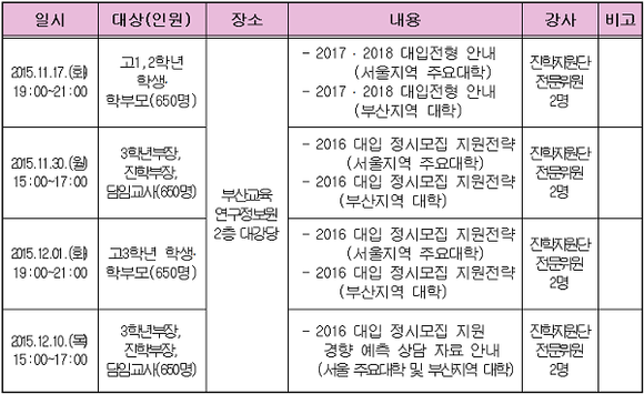 ▲부산지역 2016 정시 및 `17·18 대입 대비 입시설명회 개최 계획. (표제공=부산시교육청)