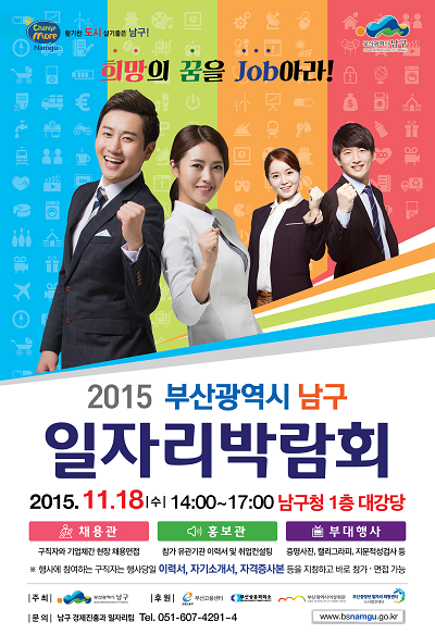 부산 남구(구청장 이종철)는 '희망의 꿈을 잡(Job)아라!'라는 슬로건으로 '2015년 남구 일자리 박람회'를 개최한다고 13일 밝혔다.