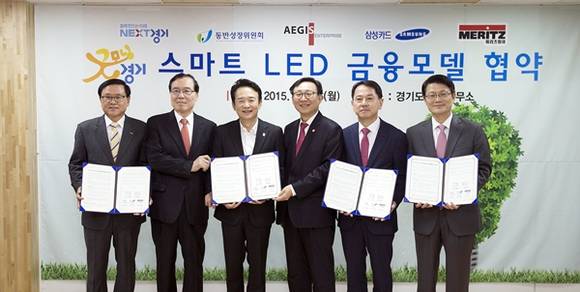 남경필 경기도지사는 16일 오전 여의도 소재 경기도서울사무소에서 안충영 동반성장위원장, 최병인 ㈜이지스엔터프라이즈 대표, 원기찬 ㈜삼성카드 대표, 강영구 ㈜메리츠화재 대표와 함께 굿모닝 경기 스마트 LED 금융모델 사업 업무 협약을 맺고 친환경 LED 보급에 힘쓰기로 약속했다.