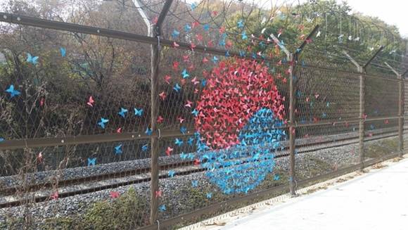 파주 도라산역 철길에 통일의 염원을 담은 메시지가 걸렸다.