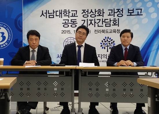서남학원 문영기 이사장과 김경안 서남대학교 총장, 이왕준 명지의료재단 이사장은 17일 전주 전라북도 교육청에서 공동 기자 간담회를 갖고 정상화 계획서 제출을 비롯한 서남대 정상화를 위한 향후 추진 세부 일정을 밝혔다.