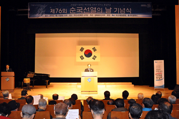 부산지방보훈청(청장 전홍범)은 17일 오전 11시 부산시민회관 소극장에서 일제에 침탈당한 국권상실의 역사적 교훈을 되새기고, 대일 항쟁기에 국권회복을 위해 항거하다 순국하신 선열들의 위훈을 기리는 '제76회 순국선열의 날 기념식'을 개최했다.