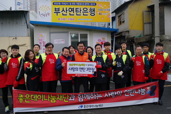 좋은데이 나눔재단(이사장 최재호)은 17일 부산 동구에서 우리 이웃의 따뜻한 겨울나기를 돕기 위한 '사랑의 연탄' 3만장을 기부했다.