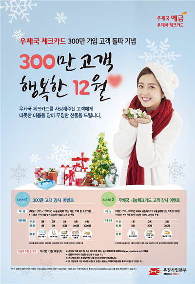 우정사업본부 부산지방우정청(청장 정한근)은 체크카드 가입 고객 300만 명 달성을 기념해 11월 19일부터 12월 25일까지 '300만 고객, 행복한 12월♡' 이벤트를 개최한다고 18일 밝혔다.