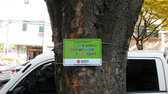 ▲광주시가 염분으로 인해 가로수 고사를 막기위해 횟집앞 1200여개소 가로수에 ‘가로수는 염분을 싫어합니다 ’라는 홍보 표찰을 설치했다.(사진=광주시)