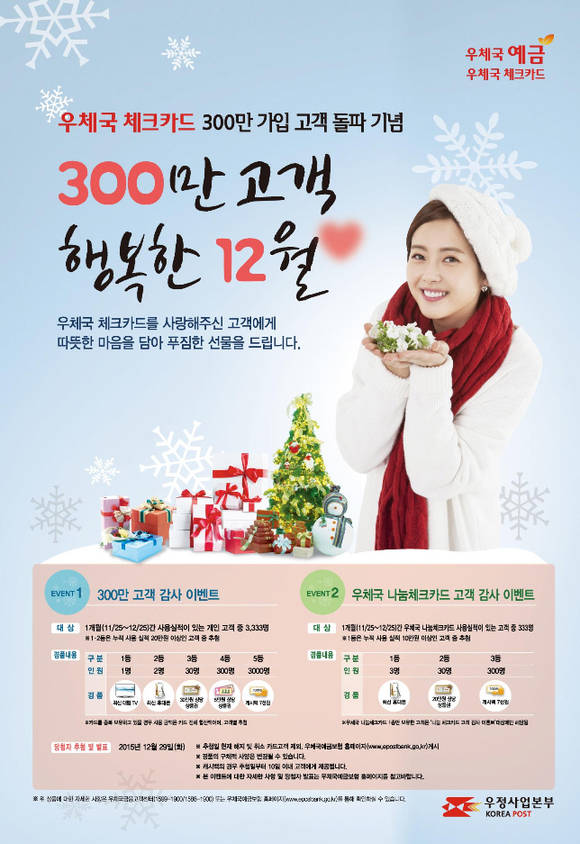 메인 이벤트인 ‘300만 고객 감사이벤트(11.25.~12.25.)’에서는 우체국 체크카드를 사용한 개인 고객 중 3,333명을 추첨하여 최신형 TV, 휴대폰, 상품권, 캐시백 등 푸짐한 경품을 증정한다.