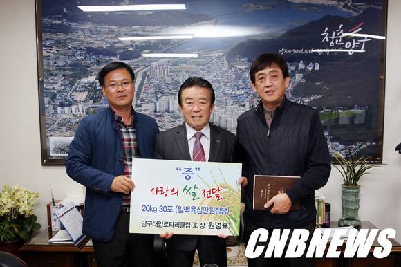 대암로터리클럽(회장 원영표)은 18일 오전 양구군청을 방문해 어려운 이웃을 위해 써달라며 전창범 양구군수에게 20㎏ 쌀 30포를 전달했다.