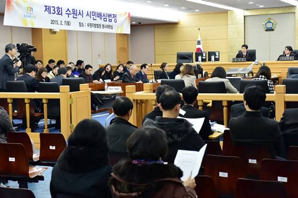 ▲지난 2월 수원지방법원 형사재판실에서 열린 광교역명 선정을 위한 시민배심법정(사진=수원시)