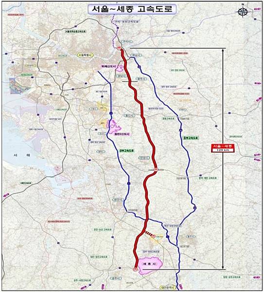 정부가 서울과 세종을 연결하는 연장 129km(6차로), 총 사업비 6조 7000억 원의 고속도로 건설사업을 민자사업으로 추진한다.