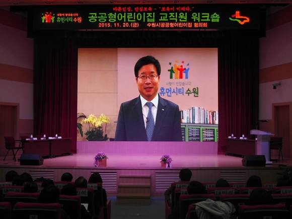 염태영 수원시장은 영상메시지를 통해 보육교직원들의 노고를 격려하고 “자발적 모임을 통해 서로 공감하는 교류의 장을 마련하게 되어 기쁘게 생각한다며 이번 워크숍이 공공형 어린이집의 보육서비스 향상에 기여할 수 있기를 바란다”고 말했다.