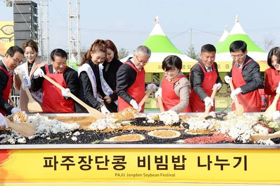 ▲이재홍 파주시장(가운데)이 미스코리아 등 내빈들과 파주장단콩 비빔밥 나누기 행사를 진행하고 있다.(사진= 파주시)