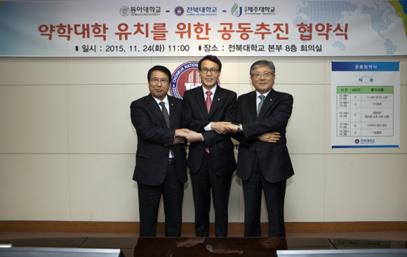 동아대(총장 권오창)는 24일 오전 전북대 본부 8층 회의실에서 열린 '약학대학 유치를 위한 공동추진 협약식'에서 전북대(총장 이남호), 제주대(총장 허향진)와 공동합의서를 채택하고 약학대학 유치를 위해 상호협력하기로 했다고 25일 밝혔다.