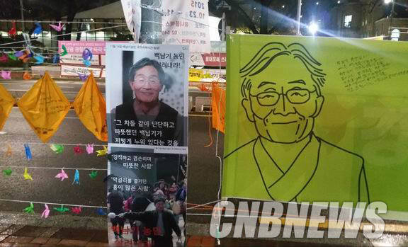 서울대병원 앞 인도 변에는 백씨의 회복을 기원하고 경찰의 강경진압을 규탄하는 천막 농성장이 설치돼 있다.
