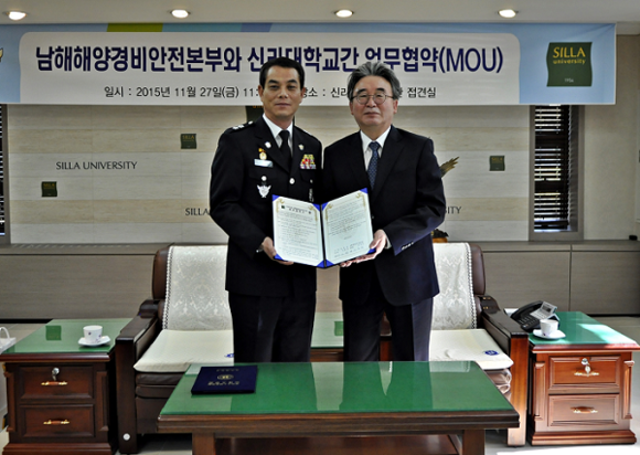 남해해양경비안전본부(본부장 이춘재)와 신라대학교(총장 박태학)는 27일 오전 11시 신라대 총장실에서 이춘재 본부장과 박태학 총장을 비롯한 양측 주요 인사들이 참석한 가운데 경·학 교류 업무협약을 체결했다.